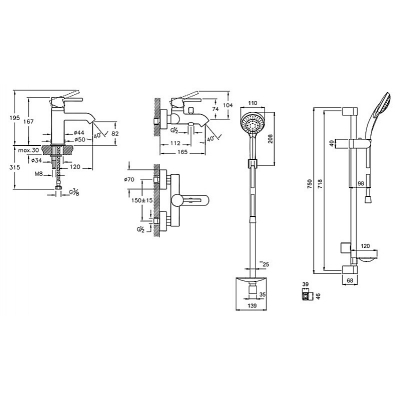 Комплект состоит из нескольких элементов. Например, смесителя, душа, душевой лейки, шлангов.