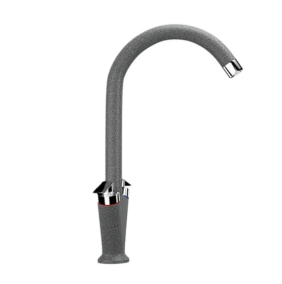 Двухвентильный смеситель с высоким поворотным изливом. Кран-букса с керамическими пластинами, корпус изготовлен из высококачественной латуни.