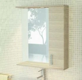 Зеркальное высококачественное полотно с амальгамой на основе серебра. Створка мебельного элемента оснащена петлями с плавным закрыванием. За створкой две горизонтальные полки. В верхнюю полку встроены два точечных светильника и выключатель.